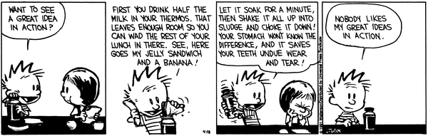 Panel 1Calvin: “Want to see a great idea in action?” Panel 2Calvin: “First you drink half the milk in your thermos. That leaves enough room so you can wad the rest of your lunch in there. See, here goes my jelly sandwich and a banana!” Panel 3Calvin: “Let it soak for a minute, then shake … Read more